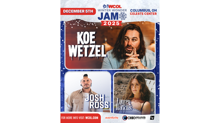 92.3 WCOL'S WINTER WONDER JAM ON FRIDAY, DECEMBER 5TH FEATURING Koe Wetzel, Josh Ross, AND Lauren Watkins ON THE ARDENT COMMUNITIES AND DRK & Co. REALTY STAGE AT CELESTE CENTER AT THE OHIO EXPO CENTER! Tickets on sale NOW -- get them HERE!